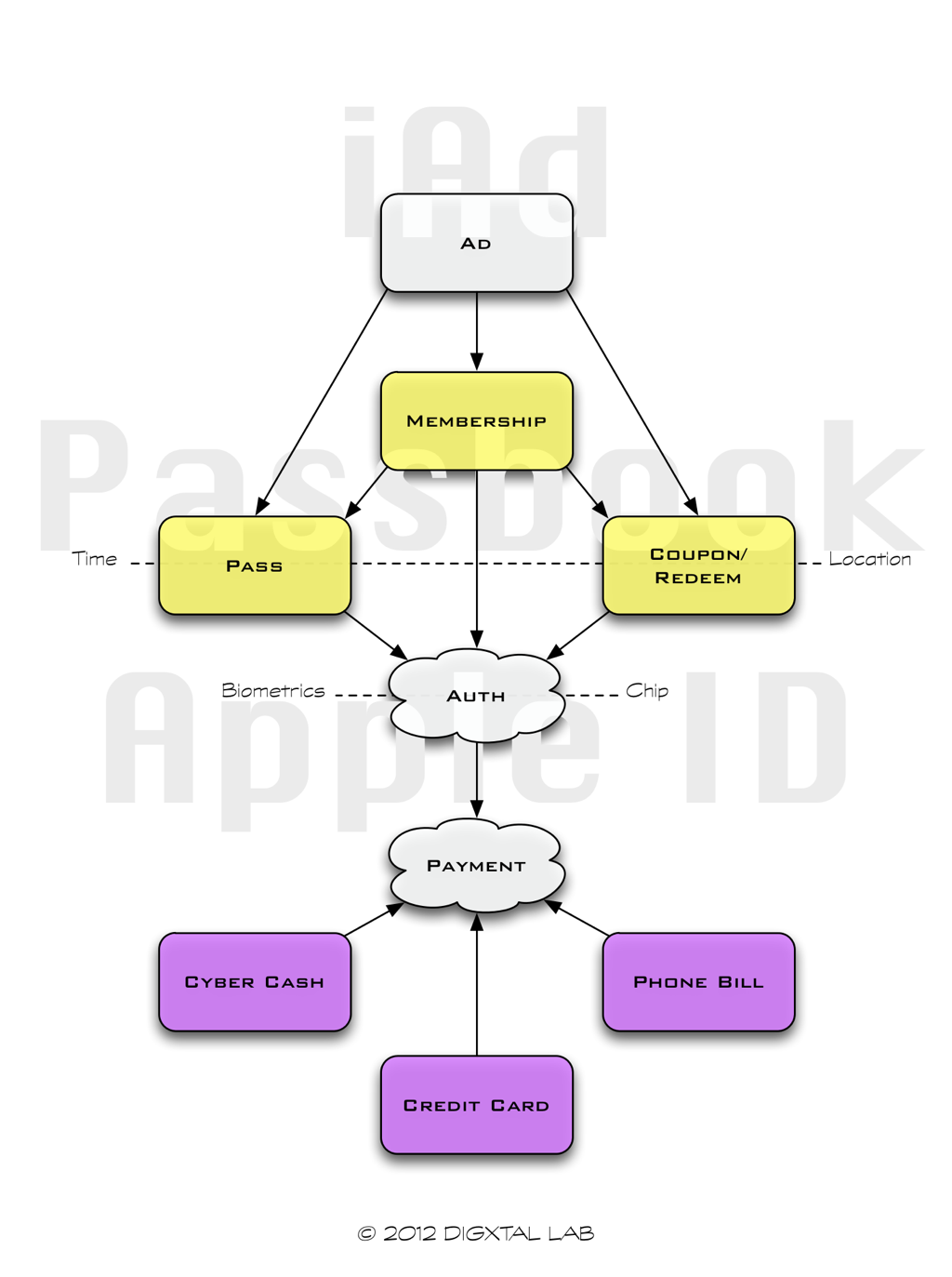이해를 돕기 위해, 애플의 서비스, 아이애드(iAd), 패스북(Passbook), 애플ID(Apple ID)를 맵핑했으니 참고로 보십시오. 그러니까 노란색의 멤버쉽, 패스, 쿠폰이 패스북의 서비스 영역, 그리고 보라색이 결제 플랫폼의 영역입니다. 특별히 인증 영역에 애플ID를 맵핑했는데, 중요한 의미가 있습니다. 그건 조금 있다 설명하겠습니다.