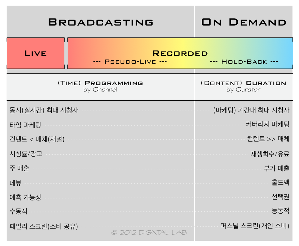 그런 얼마 안 되는 진짜 라이브를 빼면, 실상은 온디멘드와 다를 바 없는 이미 만들어진 컨텐트가 대부분입니다. 가짜 라이브[pseudo-live]인 셈이죠. 그러니 방송과 온디멘드와의 가장 큰 차이는 실은 시간별로 프로그램하느냐 안하느냐입니다. 방송은 컨텐트를 시간별로 ‘라이브’로 트는 가짜 라이브이고, 온디멘드는 그 컨텐트의 홀드백- 방송이 된 후 일정 기간이 지난 후에 유통하는 것- 라이브러리인 것입니다. 본질은 같습니다.