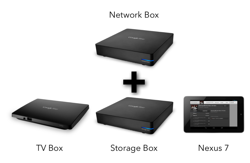 구글 파이버는 월 120달러짜리 기가비트+TV 패키지를 선택하면, 기가비트용 네트워크 박스(network box) 외에 3가지 기기를 추가로 받습니다. 바로, 기가비트 망을 통해 HDTV를 볼 수 있는 TV 박스와 DVR 역할을 하는 스토리지 박스(storage box), 그리고 TV 리모트용 태블릿인 넥서스(Nexus) 7입니다.